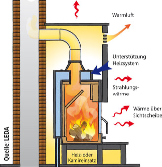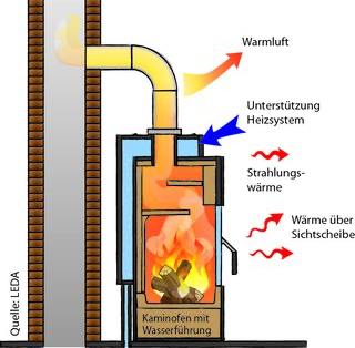 Übersicht der funktionsweise einer wasserführenden Feuerstelle im Heizsystem